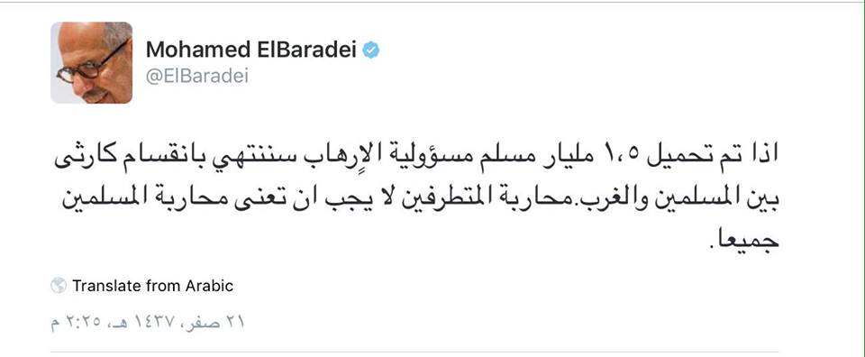 رفض الدكتور محمد البرادعي، نائب رئيس الجمهورية الأسبق، تحميل المسلمين مسؤولية أحداث التطرف والإرهاب الحادث في العالم، مؤكدًا أن ذلك سيؤدي إلى انقسام بين المسلمين والغرب.