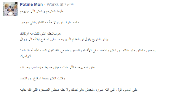 وسخرPotine Mon قائلًا: “طبعًا تشكرهم وتشكر اللي جابوهم، ما انت عارف إن لولا همًا ماكنتش تبقى موجود، هم سلاحك الذي تثبت به أركانك، ولكن التاريخ يقول إن النظام الذي يعتمد على السلاح لبقائه إلى زوال، وبعدين انت مش جاي تتكلم عن القتل والتعذيب في الأقسام والسجون طبيعي انك تقول كده ماهي أصلا تنفيذ لأوامرك، مش انت برضه اللي قلت مفيش ضابط هايتحاسب بعد كده، وقننت القتل بحجة الدفاع عن النفس، على العموم قول اللي إنت عاوزه ماحدش هايراجعك ولا حتة مجلس المسخرة اللي انت جايبه”.