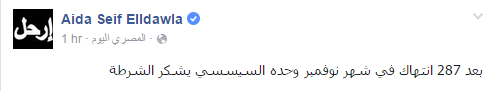 وقالت في تدوينة عبر حسابها الرسمي على موقع التواصل الاجتماعي “فيس بوك”: “بعد 287 انتهاكا في شهر نوفمبر وحده السيسي يشكر الشرطة”.