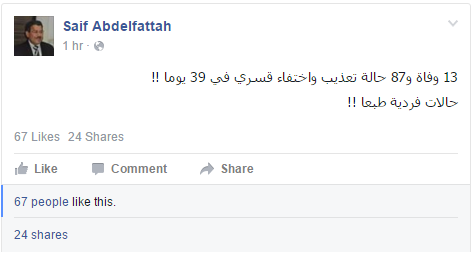 ومن جانبة قال الدكتور سيف عبد الفتاح استاذ العلوم السياسية، بجامعة القاهرة :أن جرائم الشرطة خلال الشهر الماضي فقط 13 وفاة و87 حالة تعذيب واختفاء قسري في 39 يوما، ساخرا: “حالات فردية طبعا”.