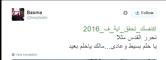– Basma: “نحرر القدس مثلا.. يا حلم بسيط وعادي.. مالك يا حلم بعيد”.