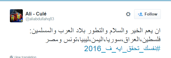 –Ali : “أتمنى أن يعم الخير والسلام والتطور بلاد العرب والمسلمين، فلسطين، العراق، سوريا، اليمن، ليبيا، تونس ومصر”.