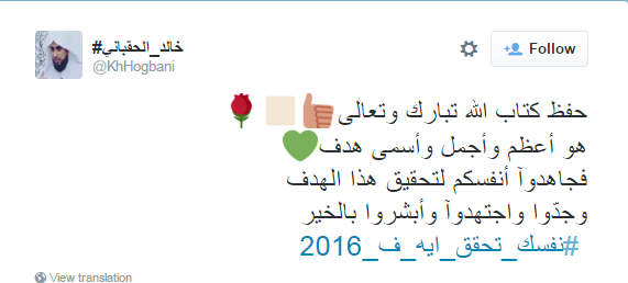 -خالد الحقباني: “حفظ كتاب الله تبارك وتعالى هو أعظم وأجمل وأسمى هدف، فجاهدوا أنفسكم لتحقيق هذا الهدف، وجدّوا واجتهدوا وأبشروا بالخير”.