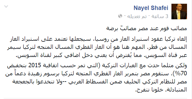 واستدرك “الشافعي” قائلًا: “ولكن مثلما حدث مع العبارات التركية (التي تمر حسب اتفاقية 2015 بتخفيض 70%)، ستقوم مصر بتمرير الغاز القطري المتجه لتركيا برسوم زهيدة دعمًا من مصر للنظام التركي الحليف ضمن الفسطاط الغربي”، وأضاف “ولا تنخدعوا بالجعجعة المتبادلة خلونا نتفرج”.