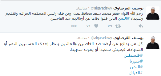 وقال القرضاوي -عبر تغريدات له على “تويتر”-: “رحم الله اللواء جعفر محمد سعد محافظ عدن، ومن قبله رئيس المحكمة الجزائية وتقبلهم وشهداء اليمن الذين قتلوا دفاعًا عن أوطانهم ضد الغاصبين”.