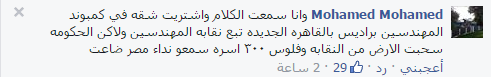 – Mohamed Mohamed: “أنا سمعت الكلام واشتريت شقة في كمبوند المهندسين براديس بالقاهرة الجديدة تبع نقابة المهندسين ولكن الحكومة سحبت الأرض من النقابة وفلوس 300 أسرة سمعوا نداء مصر ضاعت”.