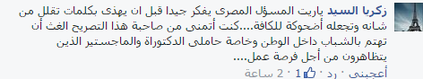 – زكريا السيد: “ياريت المسؤول المصري يفكر جيدًا قبل أن يهذي بكلمات تقلل من شأنه وتجعله أضحوكة للكافة…. كنت أتمنى من صاحبة هذا التصريح الغث أن تهتم بالشباب داخل الوطن وخاصة حاملي الدكتوراه والماجستير الذين يتظاهرون من أجل فرصة عمل”.