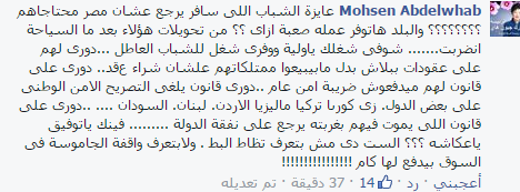 – Mohsen Abdelwhab: “عايزة الشباب اللي سافر يرجع عشان مصر محتاجاهم؟ والبلد هاتوفر عملة صعبة ازاي؟؟ من تحويلات هؤلاء بعد ما السياحة انضربت……. شوفي شغلك يا ولية ووفري شغل للشباب العاطل… دوري لهم على عقودات ببلاش بدل مابيبيعوا ممتلكاتهم علشان شراء عقد.. دوري على قانون لهم ميدفعوش ضريبة أمن عام.. دوري على قانون يلغي التصريح الأمن الوطني على بعض الدول، زي كوريا تركيا ماليزيا الأردن لبنان السودان…. دوري على قانون اللي يموت فيهم بغربته يرجع على نفقة الدولة”.