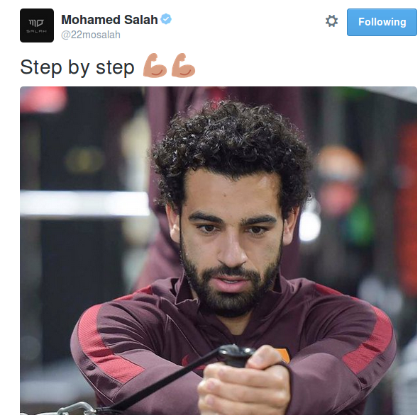 ونشر “صلاح” صورة على حسابه الرسمي بموقع التواصل الاجتماعي “فيس بوك” وهو يخوض فترة تأهيل استعدادًا لعودته للملاعب؛ حيث علق عليها قائلًا: “سأعود للملاعب خطوة بخطوة”.