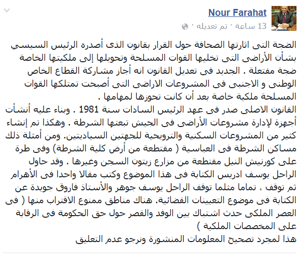 وأوضح -عبر منشور له على “فيس بوك”- “القانون الأصلي صدر في عهد الرئيس السادات سنة 1981، وبناءً عليه أنشأت أجهزة لإدارة مشروعات الأراضي في الجيش تبعتها الشرطة”.