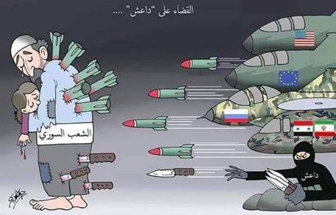 وتداول مستخدمو موقع التواصل الاجتماعي “فيس بوك” هذا الرسم المعبر عن مأساة الشعب السوري الذي تقوم دول العالم جميعها بالإضافة إلى تنظيم “الدولة” بقصفه وقتله: