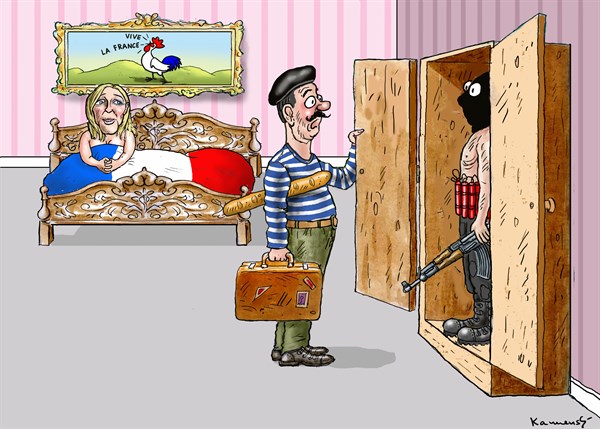 أما عن اختباء الإرهابيين في فرنسا فنشر موقع “بولتيكال كارتونز” هذا الرسم:
