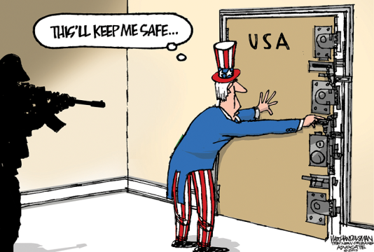 ونبدأ جولة الكاريكاتير من قانون حمل السلاح الأميركي الذي نشر موقع “يو إس نيوز” عنه هذا الرسم الساخر الذي يصور الأميركيين وهم يغلقون الباب بالقوانين أمام انتشار السلاح بينما هو في واقع الحال منتشر في الداخل: