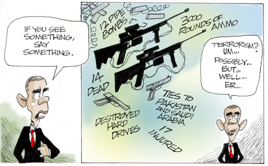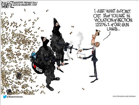 ونشر موقع “تاون هال” هذا الرسم عن ذات الموضوع، حيث صور الرئيس الأميركي باراك أوباما وهو يواجه مسلحين من تنظيم “الدولة” بقانون حمل السلاح الأميركي الذي يسعى لإقراره: