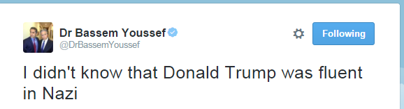 وقال باسم يوسف -في تغريدة باللغة الإنجليزية على “تويتر”، صباح اليوم الثلاثاء-: “لم أكن أعلم أن دونالد ترامب يجيد النازية”.