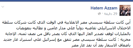 ويجيب “عزام”: “الإجابة مخزية.. كانت سلطة سيسي مصر تتفق مع “إسرائيل” على استيراد غاز جديد بأضعاف الأسعار بعد أن نفذ عاز مصر”.