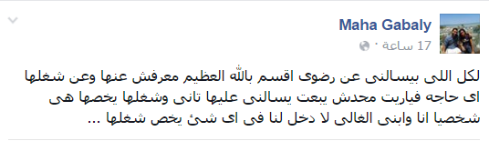 وكتبت مها جبلي، والدة زوجها المتوفى، أحمد جبلي، أنها لا تعرف شيئًا عن الأمر، وأنها لا دخل لها ولا لولدها في كل ما يتعلق بشغل رضوى، مطالبة كل من يسألها عنها بأن يكف عن السؤال.