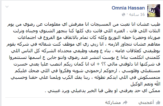 وظهرت منشورات لبعض المحيطين بـ”رضوى” ويؤكدون اختفاءها منذ يوم الثلاثاء الماضي وينفون مسؤوليتهم عن الحادث، منهم أمنية حسن، مسؤولة العلاقات العامة بالشركة، ومها جبلي، والدة زوجها.