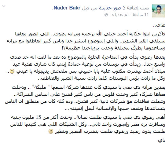 وقال ـعبر حسابه الشخصي بالـ”فيس بوك”ـ: إن رضوى بدأت في المتاجرة بموضوع وفاة زوجها وتعاطف الناس معها، وأنشأت شركة باسم “مليكة” لتصميم أزياء المحجبات، ودخل معها العديد من الشركاء، وتعاقدت مع العديد من الشركات من أجل مساعدتها.