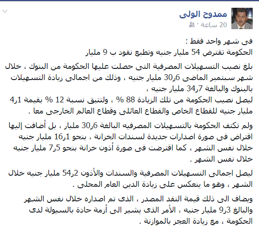 وأضاف -عبر منشور له على “فيس بوك”- أن الحكومة لم تكتف بالتسهيلات المصرفية البالغة 30.6 مليار، بل أضافت إليها اقتراضًا في صورة إصدارات جديدة لسندات الخزانة، بنحو 16.1 مليار جنيه خلال الشهر نفسه.