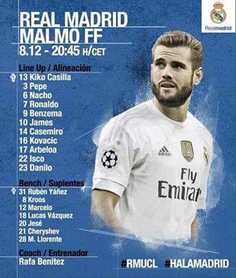 أعلن المدرب رافا بينيتيز المدير الفني لنادي ريال مدريد الإسباني عن التشكيل الرسمي لفريقه في مواجهة نادي مالمو السويدي مساء اليوم الثلاثاء في الجولة الأخيرة من دور المجموعات بدوري أبطال أوروبا لموسم 2015/2016 بملعب سنتياجو برنابيو معقل الفريق الملكي.
