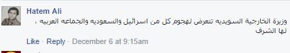 وأضاف حاتم علي “وزيرة الخارجية السويدية تتعرض لهجوم كل من إسرائيل والسعودية والجماعة العربية، لها الشرف”.