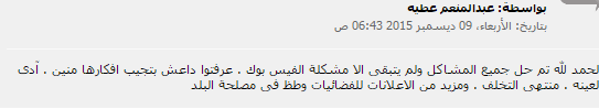 – عبدالمنعم عطية: “الحمد لله تم حل جميع المشاكل ولم يتبق إلا مشكلة الفيس بوك.. عرفتوا داعش بتجيب أفكارها منين.. آدى العينة.. منتهى التخلف.. ومزيد من الإعلانات للفضائيات وطظ فى مصلحة البلد”.