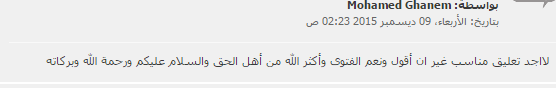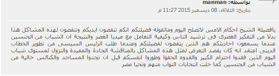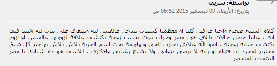 –manman : “يافضيلة الشيخ أحكام الأمس لاتصلح اليوم وماتقوله فضيلتكم انكم تنفضون أيديكم وتنفضون لهذه المشاكل هذا بدلا من التفكير العصري في ترشيد الناس وكيفية التعامل مع ميديا العصر، والنتيجة أن الشباب من الجنسين عندما يسمعون أحاديثكم هم الذين ينفضون لفضيلتكم وعندما طلب الرئيس السيسى من تطوير الخطاب الديني اعتقد أنه كان يقصد التعرض لمثل هذه المشاكل بالمناقشة الجادة والمفيدة والنزول لمستوى شباب اليوم الذين فقدوا احترام الكبير والقدوة الحقوا وطوروا انفسكم قبل أن تجدوا المساجد والكنائس خالية من الشباب من الجنسين كما خلت انتخابات النواب منهم وتحيا مصر”.