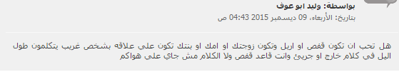 - وليد أبو عوف: “هل تحب ان تكون قفص وتكون زوجتك أو أمك أو بنتك تكون على علاقة بشخص غريب يتكلمون طول اليل في كلام خارج أو جرئ وانت قاعد قفص، ولا الكلام مش جاي على هواكم؟”.