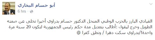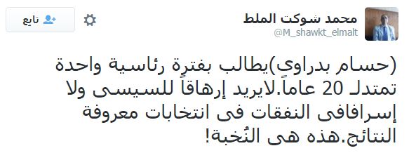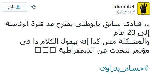 بينما كتب أبوحسام البخاري: “القيادي البارز بالحزب الوطني المنحل الدكتور حسام بدراوي أخيرا تخلى عن صمته الطويل وخرج ليقول: أطالب بتعديل مدة حكم رئيس الجمهورية لتكون 20 سنة مرة واحدة! بدراوي سكت دهرا ونطق كفرا”.
