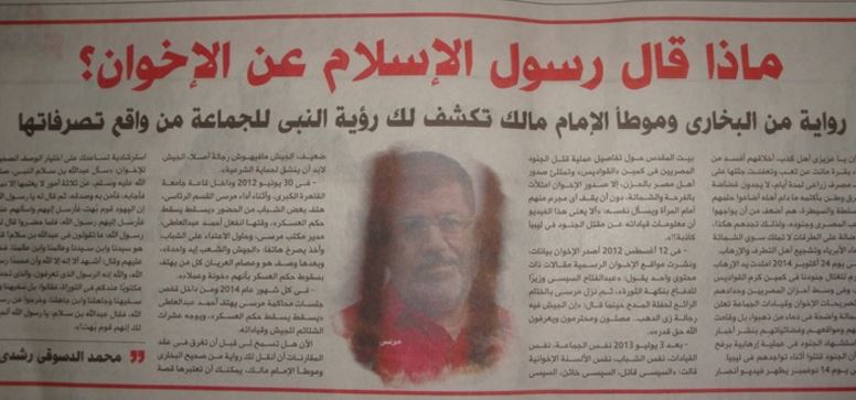 جاء ذلك في مقال كتبه بالجريدة اليوم الخميس، والذي جاء بعنوان: “ماذا قال رسول الإسلام عن الإخوان؟”، حيث قال إن “رواية من البخاري وموطأ الإمام مالك تكشف لك رؤية النبي للجماعة من واقع تصرفاتها”، وهو نفس المقال الذي سبق للكاتب أن نشره بموقع الجريدة على الإنترنت، الإثنين 17 نوفمبر 2014، تحت عنوان: “ماذا قال النبي محمد عن جماعة الإخوان؟”.