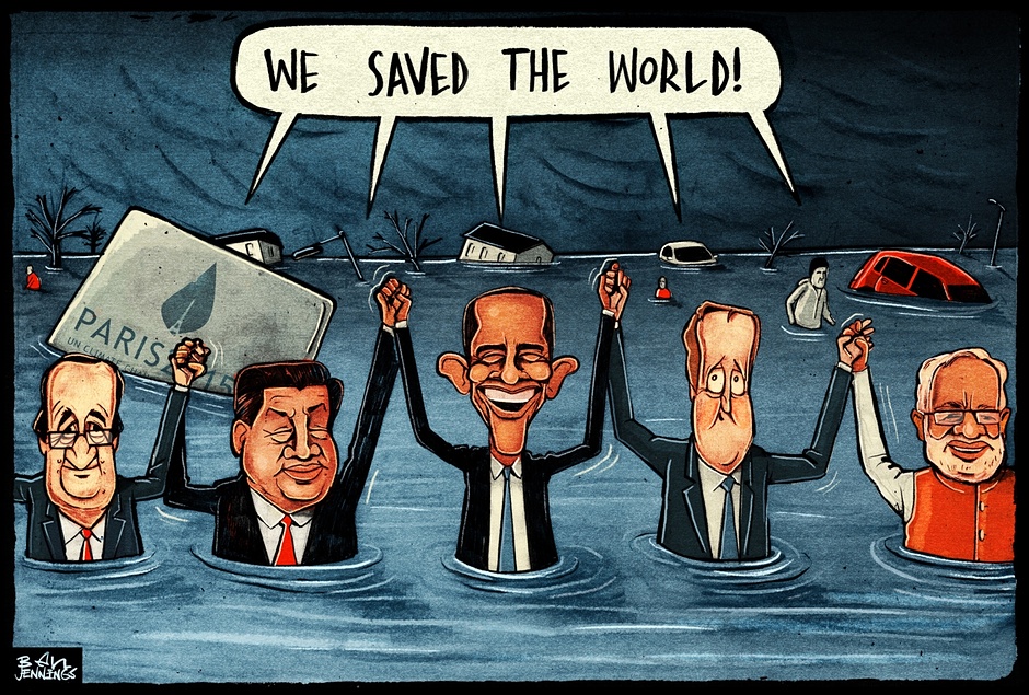 ونشرت جريدة “الجارديان” البريطانية هذا الرسم ساخرة من مؤتمر المناخ العالمي بباريس؛ حيث صورت العالم يغرق فيما يدعي قادة العالم أنهم يعملون على حمايته:
