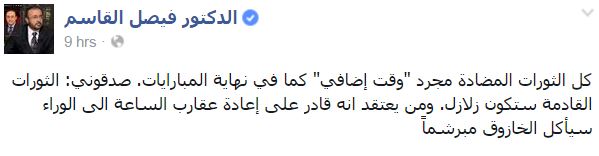 وقال القاسم في تغريدة له عبر حسابه الشخصي على موقع التواصل الاجتماعي “تويتر”: “كل الثورات المضادة مجرد “وقت إضافي” كما في نهاية المباريات”.