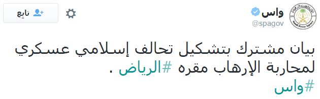 ذكرت وكالة الأنباء السعودية الرسمية “واس”، عبر تغريدة في حسابها الرسمي على موقع “تويتر”، أنه صدر بيان مشترك بتشكيل تحالف إسلامي عسكري لمحاربة الإرهاب، مقره الرياض.