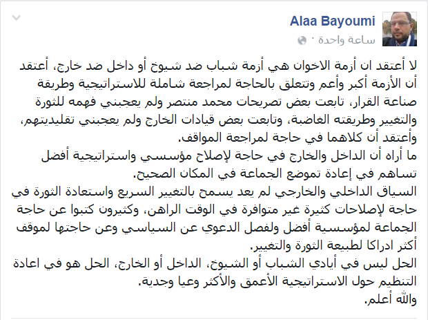 قال الباحث والمحلل السياسي، علاء بيومي، “أعتقد أن أزمة جماعة الإخوان المسلمين أكبر وأعم من أن تكون أزمة شباب ضد شيوخ أو داخل ضد خارج، وتتعلق بالحاجة لمراجعة شاملة للإستراتيجية وطريقة صناعة القرار”.