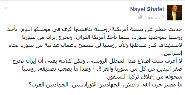 قال نائل الشافعي، مدير الموسوعة الإلكترونية “معرفة”، “إن هناك حديثًا خطيرًا عن صفقة أميركية- روسية يناقشها كيري في موسكو اليوم، تأخذ روسيا بموجبها سوريا، بينما تأخذ أميركا العراق”.