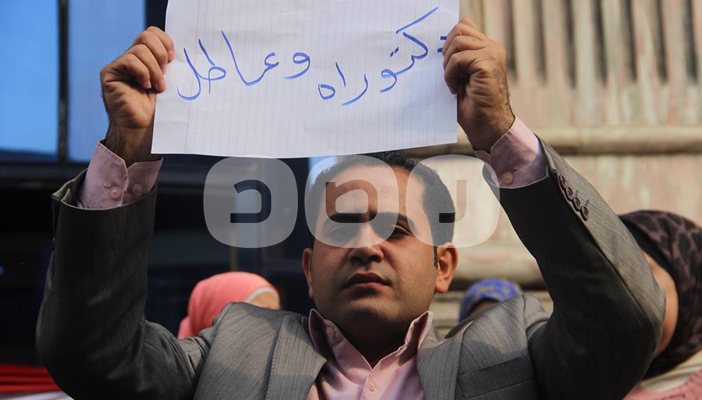 حمل المشاركون لافتات كتبوا عليها “ماجستير وعاطل”.