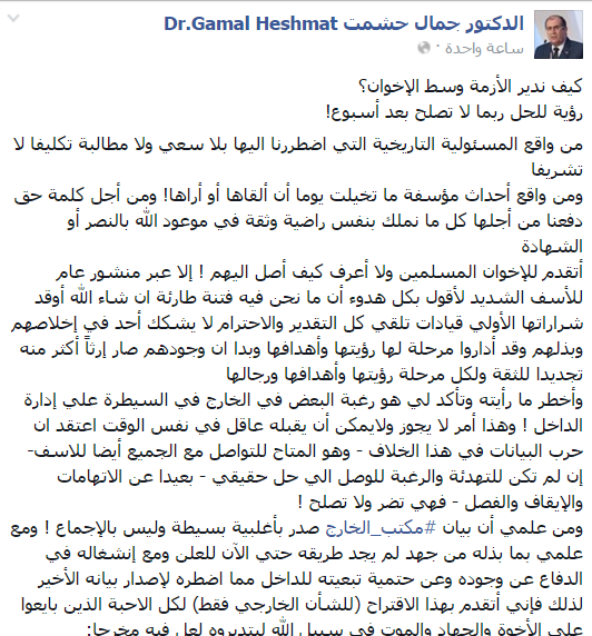 وتابع منشوره قائلاً: “ومن علمي أن بيان مكتب الخارج صدر بأغلبية بسيطة وليس بالإجماع! ومع علمي بما بذله من جهد لم يجد طريقه حتى الآن للعلن ومع انشغاله في الدفاع عن وجوده وعن حتمية تبعيته للداخل مما اضطره لإصدار بيانه الأخير؛ لذلك فإني أتقدم بهذا الاقتراح (للشأن الخارجي فقط) لكل الأحبة الذين بايعوا على الأخوَّة والجهاد والموت في سبيل الله ليتدبروه لعل فيه مخرجا”.