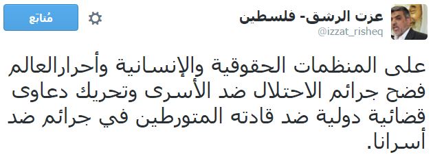 طالب عضو المكتب السياسي لحركة المقاومة الإسلامية “حماس”، عزت الرشق، المنظمات الحقوقية والإنسانية وأحرار العالم فضح جرائم الاحتلال ضد الأسرى وتحريك دعاوى قضائية دولية ضد قادته.