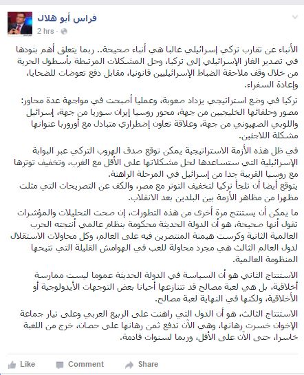 وأضاف “أبو هلال”، في منشور له بصفحته على موقع التواصل الاجتماعي “فيس بوك”، “تركيا في وضع إستراتيجي يزداد صعوبة، وعمليًا أصبحت في مواجهة عدة محاور: مصر وحلفائها الخليجيين من جهة، محور روسيا إيران سوريا من جهة، إسرائيل واللوبي الصهيوني من جهة، وعلاقة تعاون اضطراري متبادل مع أوروبا عنوانها مشكلة اللاجئين”.