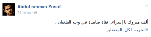 – الشاعر عبد الرحمن يوسف: “ألف مبروك يا إسراء، فتاة صامدة في وجه الطغيان، الحرية لكل المعتقلين”.
