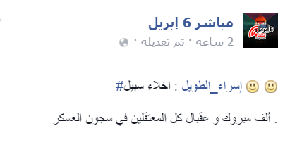 – مباشر 6 إبريل:” #إسراء_الطويل إخلاء سبيل ألف مبروك وعقبال كل المعتقلين في سجون العسكر”.