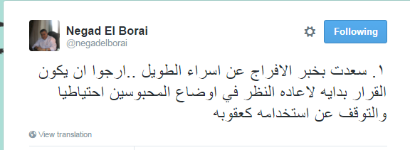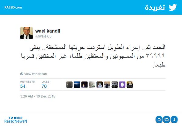 – الناشط الحقوقي، نجاد البرعي: “سعدت بخبر الإفراج عن إسراء الطويل.. أرجو أن يكون القرار بداية لإعادة النظر في أوضاع المحبوسين احتياطيا والتوقف عن استخدامه كعقوبة”.