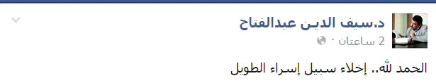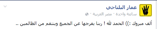 – الناشط السياسي عمار البلتاجي: “ألف مبروك .. الحمد لله ! ربنا يفرجها عن الجميع وينتقم من الظالمين”.