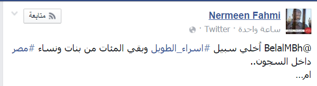 Nermeen Fahmi-: “اُخلي سبيل #اسراء_الطويل وبقي المئات من بنات ونساء مصر داخل السجون”.