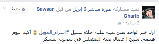 Sawsan Gharib-: “أول خبر الواحد يفتح عينه عليه إخلاء سبيل #اسراء_الطويل أكيد اليوم هيبقي مبهج ! عقبال بقية المعتقلبن في سجون العسكر”.
