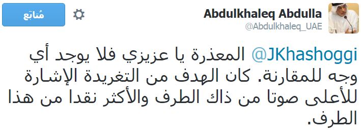 وعقب تعليق خاشقجي على تغريدة عبدالخالق عبدالله، علق قائلًا: “المعذرة يا عزيزي فلا يوجد أي وجه للمقارنة كان الهدف من التغريدة الإشارة للأعلى صوتا من ذاك الطرف والأكثر نقدا من هذا الطرف”.