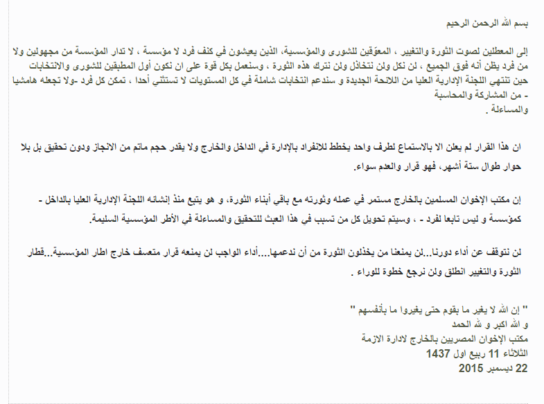 نشر موقع “إخوان أون لاين” والذي يعبر عن مجموعة الدكتور محمد كمال عضو مكتب الإرشاد بيانا للرد على قرار الدكتور محمود عزت، القائم بأعمال المرشد العام لجماعة الإخوان المسلمين، والذي يقضي بحل مكتب إدارة الأزمة بالخارج، وتكليف إدارة رابطة الإخوان المصريين في الخارج بالملفات التي كان يتولاها مكتب إدارة الأزمة.