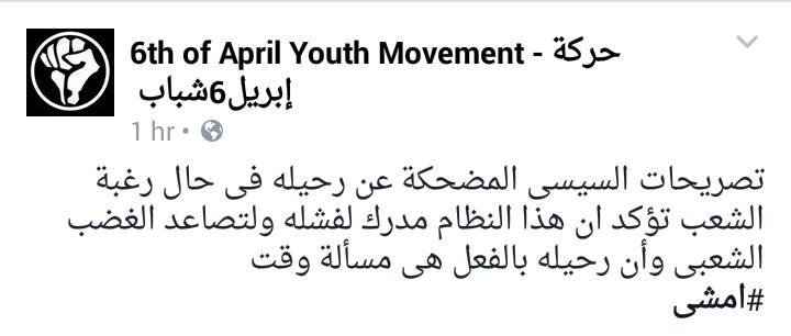 سخرت حركة شباب 6 أبريل من خلال صفحتها الرسمية بموقع التواصل الاجتماعي فيس بوك، من تصريحات السيسي الأخيرة عن رحليه في حال إذا رغب الشعب في ذلك.