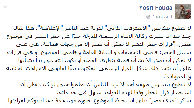 قال الإعلامي يسري فودة إن قرارات حظر النشر لا يمكن أن تصدر إلا من جهات قضائية، هي على سبيل الحصر؛ قاضي التحقيقات والنيابة العامة وقاضي الموضوع.